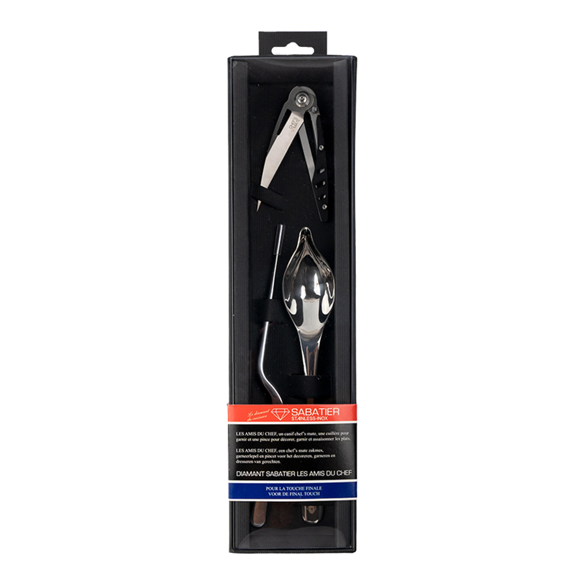 Diamant Sabatier Final Touch: Een gerecht ècht af maken gaat om het decoreren, garneren en dresseren. Daar zijn deze tools perfect voor, met de saus lepel kun je de hoeveelheid saus goed doseren en mooi over de borden heen druppelen. Met het pincet breng je de laatste finishing touch aan, bijvoorbeeld een krokantje of een paar kiem groente. Deze kun je door de ribbels aan het einde goed beetpakken. Het mesje, wat ook nog perfect in een koksbuis past, is handige voor kleine taakjes zoals: dozen op snijden, verse kruiden afsnijden en verpakkingen openen.
