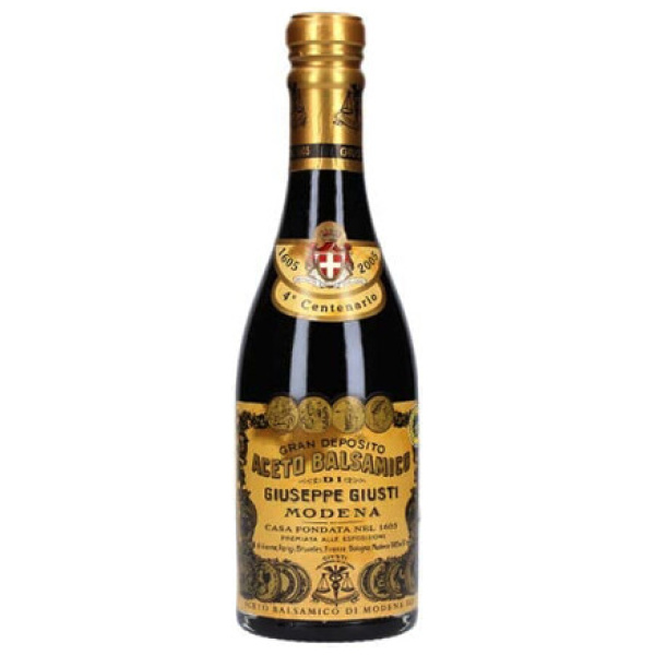De “Quarto Centenario” is geboren om de 400ste verjaardag van de Giusti-familie te vieren en is een extreem volle balsamico-azijn van 15 jaar oud. Rijk aan aroma’s en aroma’s van rijp fruit, vergezeld van tonen van tabak, gebrande koffie en hints van hout afkomstig van een lange veroudering.