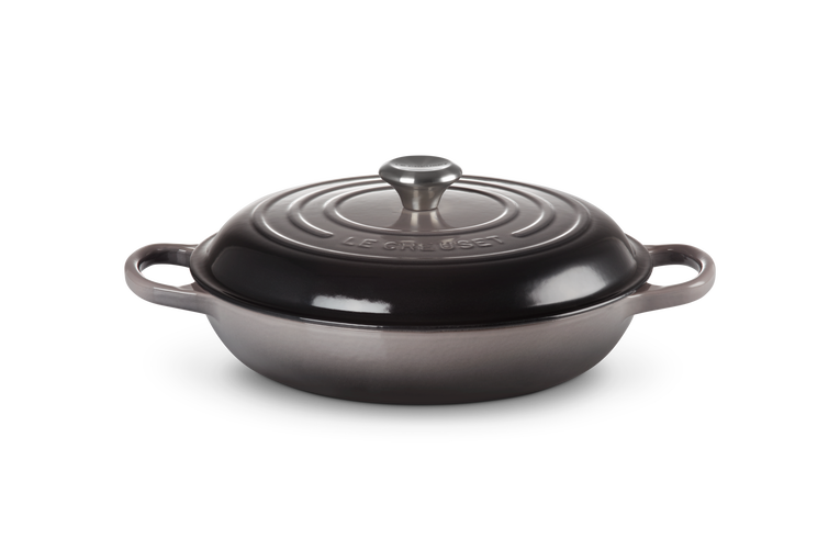 De Flint Campagnard Signature braadpan van Le Creuset heeft een diameter van 30 cm. De ronde pan van geëmailleerd gietijzer heeft een inhoud van 3,5 liter, bedoeld voor 4-6 personen. De braad-/ stoofpan heeft extra grote grepen.