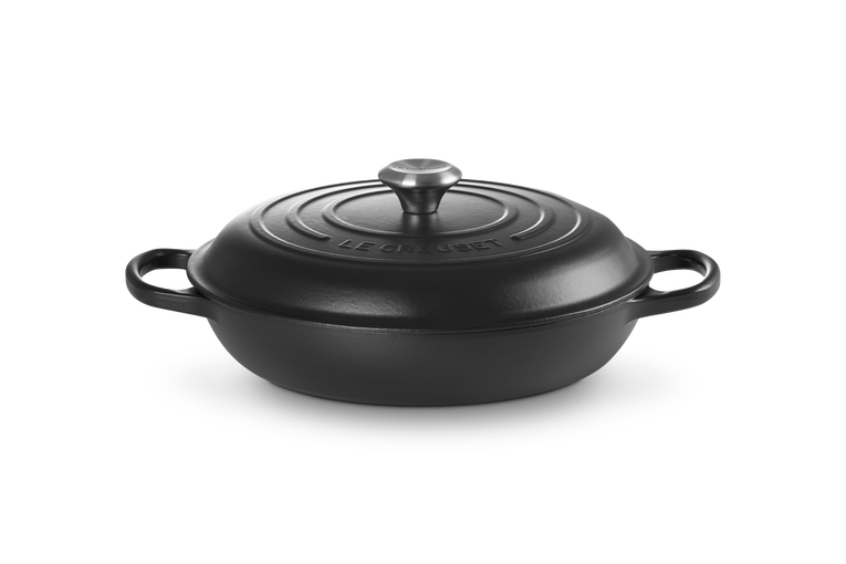 De matzwarte Campagnard Signature braadpan van Le Creuset heeft een diameter van 30 cm. De ronde pan van geëmailleerd gietijzer heeft een inhoud van 3,5 liter, bedoeld voor 4-6 personen. De braad-/ stoofpan heeft extra grote grepen.