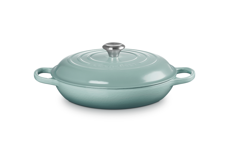 De Sea Salt Campagnard Signature braadpan van Le Creuset heeft een diameter van 30 cm. De ronde pan van geëmailleerd gietijzer heeft een inhoud van 3,5 liter, bedoeld voor 4-6 personen. De braad-/ stoofpan heeft extra grote grepen.