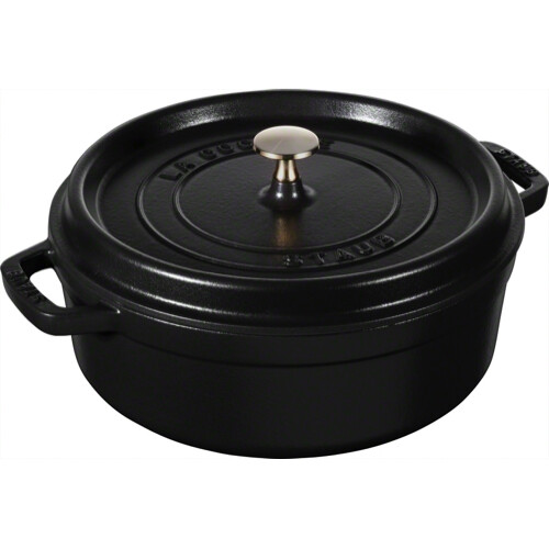 Staub Braadpan Laag Zwart-26cm: Het mat zwart afgewerkte emaille aan de binnenzijde vereenvoudigt bovendien het onderhoud van uw cocotte. Tevens is de platte deksel uitgerust met picots zodat uw gerecht continu en gelijkmatig wordt bevochtigd. Bovendien zorgt het ook voor een nog sappiger resultaat. Dit komt doordat  het de warmte uitstekend vasthoudt.